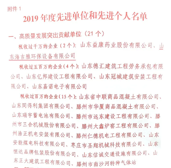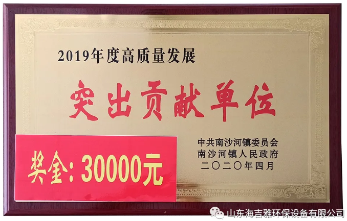 2019年度海吉雅环保实现税收一千五百余万元为南沙河镇经济发展做出了重要贡献,荣获“高质量发展突出贡献单位”称号。