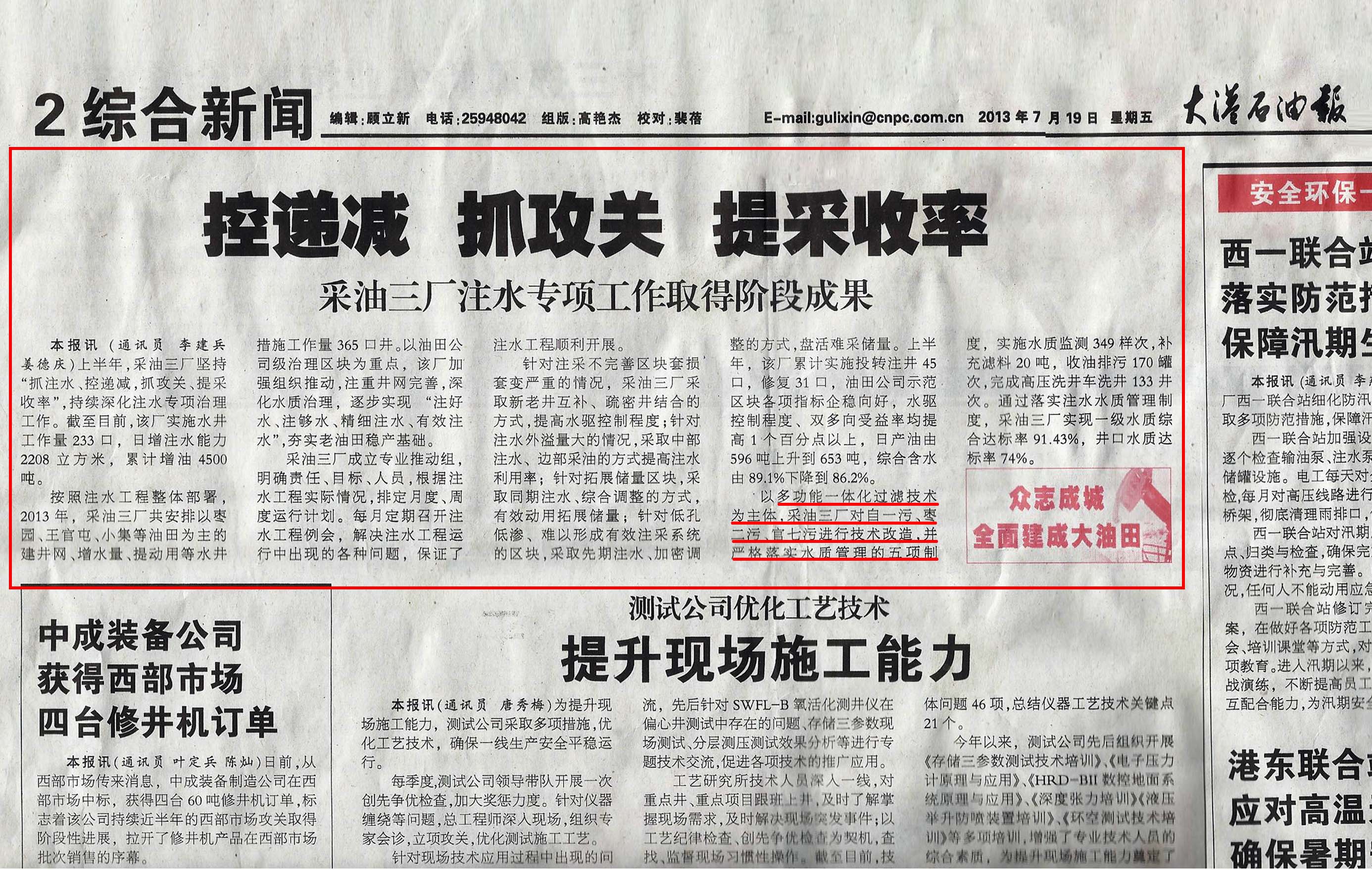 2013年6月公司产品被《大港石油报》多次报道