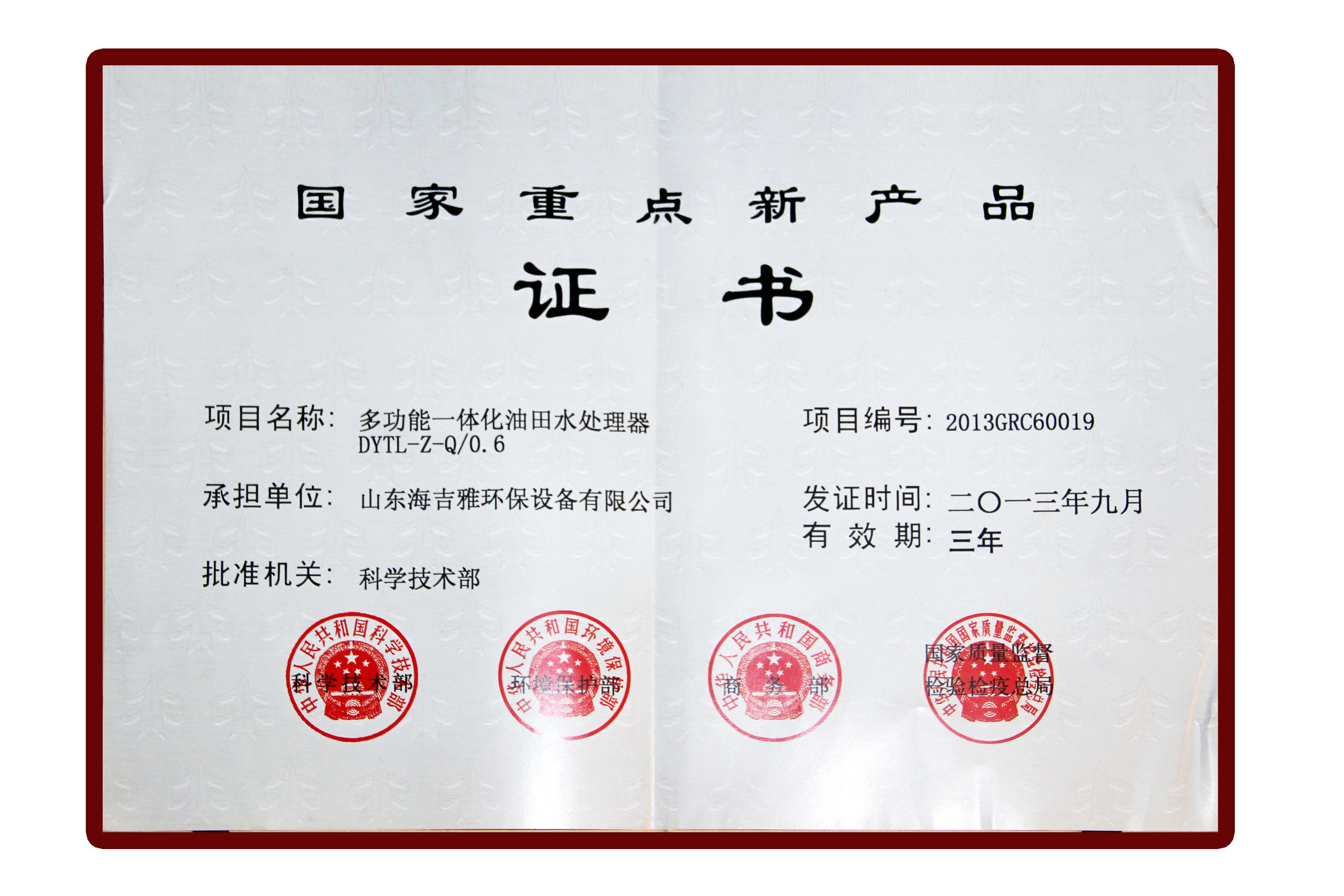 国家重点新产品证书